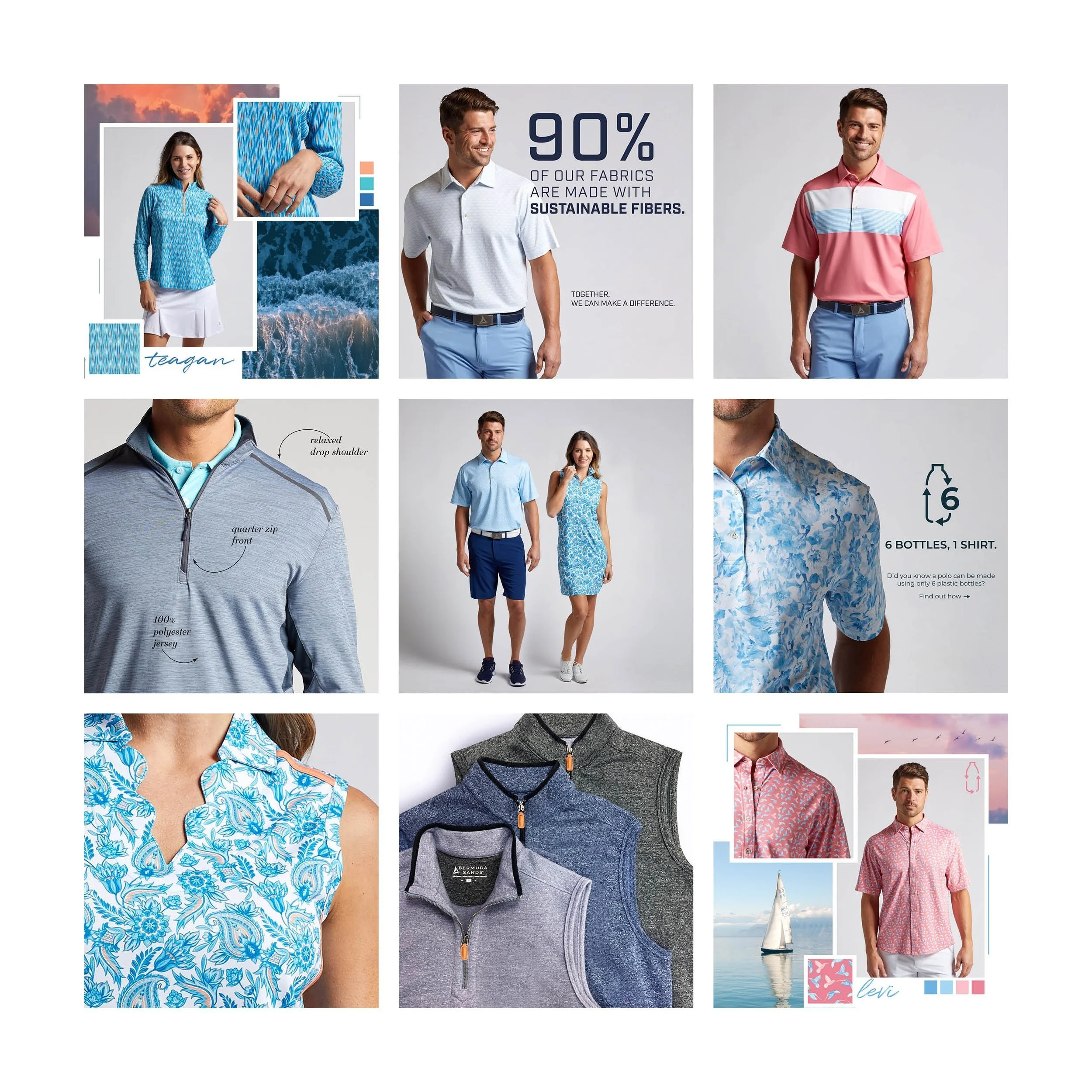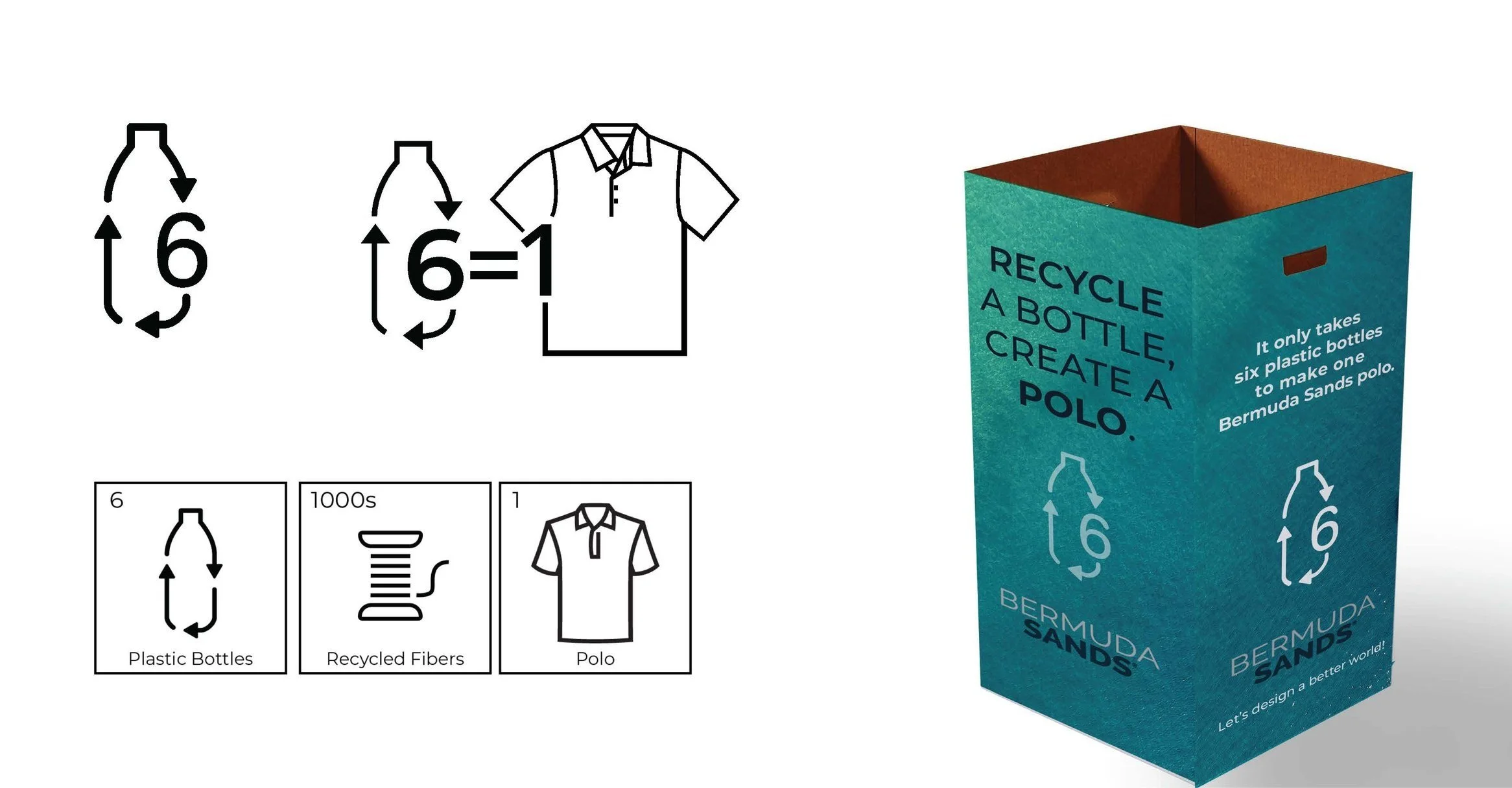 At Bermuda Sands Apparel, I developed the “Elements of Style” campaign that was designed for a wide range of uses. This references the process of a Repreve garment being made, where it only needs 6 water bottles worth of plastic to create one shirt. I believed promoting the sustainability aspect of the brand was very important, and designed engaging ways this could be expanded upon. For example, a design for a branded recycling bin that could be placed at a golf course or sporting good store, to give the audience the idea that their plastic bottle can go directly into their next shirt. Even with this, the potential customer is still engaging with the brand's core values of environmentalism.